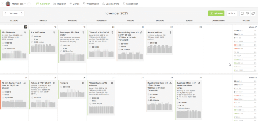 Geen ad-hoc trainingen meer. Met de intuïtieve interface bouw ik gestructureerde, periodieke programma’s in minuten op. Ik zorg voor een perfect overzicht zodat elke sessie doelgericht is en in lijn ligt met jouw lange-termijn ambitie. Zo weet jij altijd precies wat je moet doen.